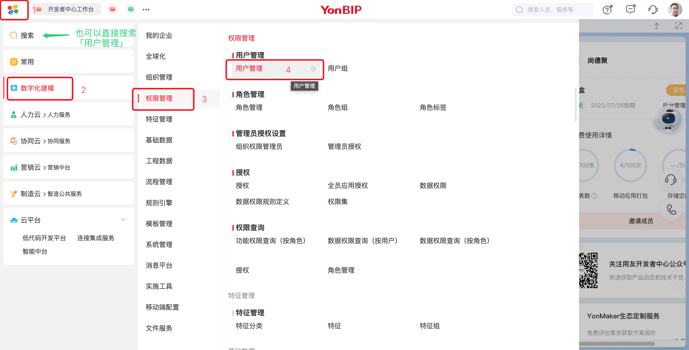 1.1 点击风车导航图标(左上角)-选择「数字化建模」-「权限管理」-「用户管理」
