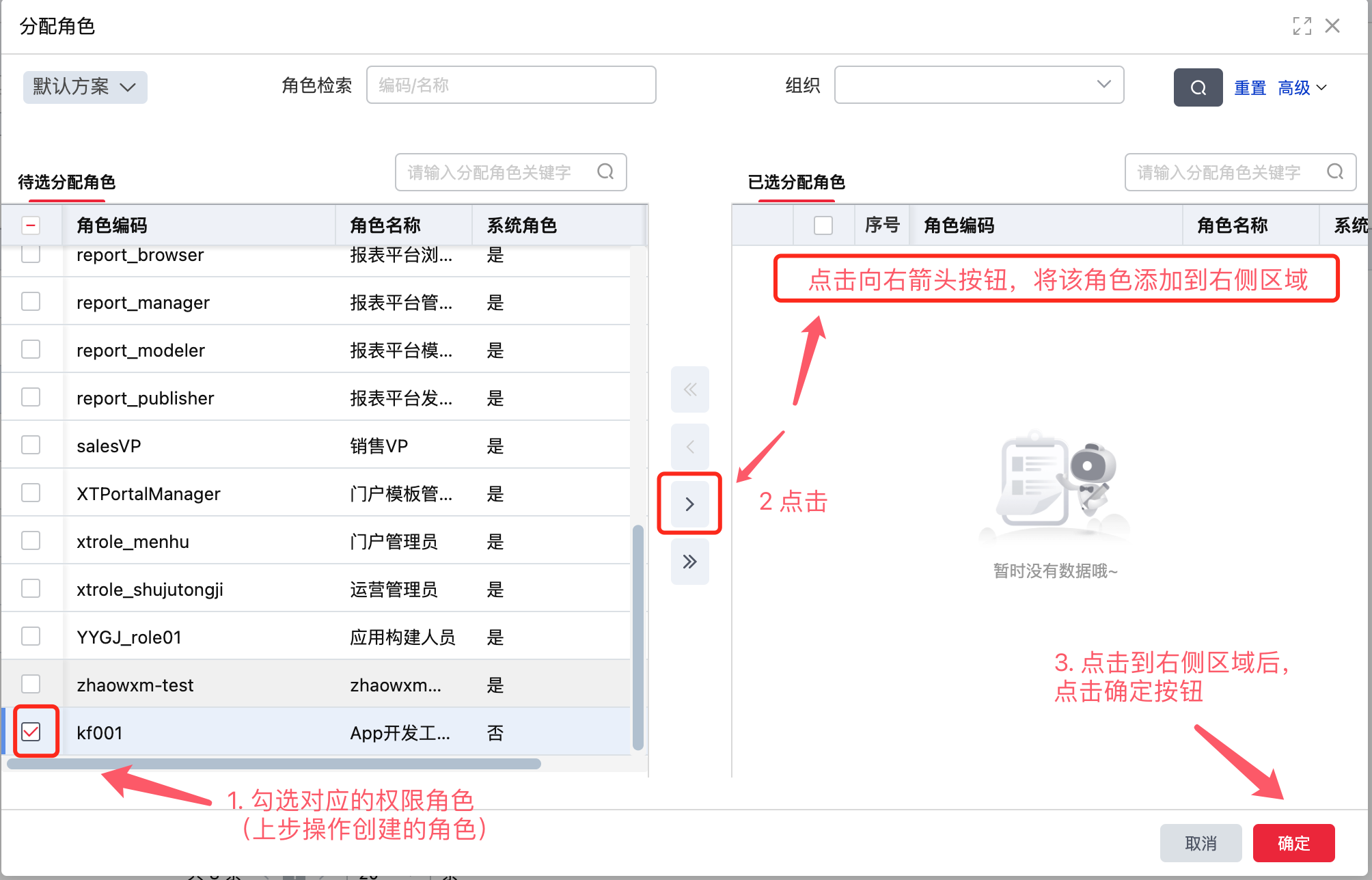 在「分配角色」对话框中,左侧区域勾选对应的角色,点击右侧的「向右箭头」按钮,将该角色移动到右侧已选择区域,再点击底部的「确定」按钮