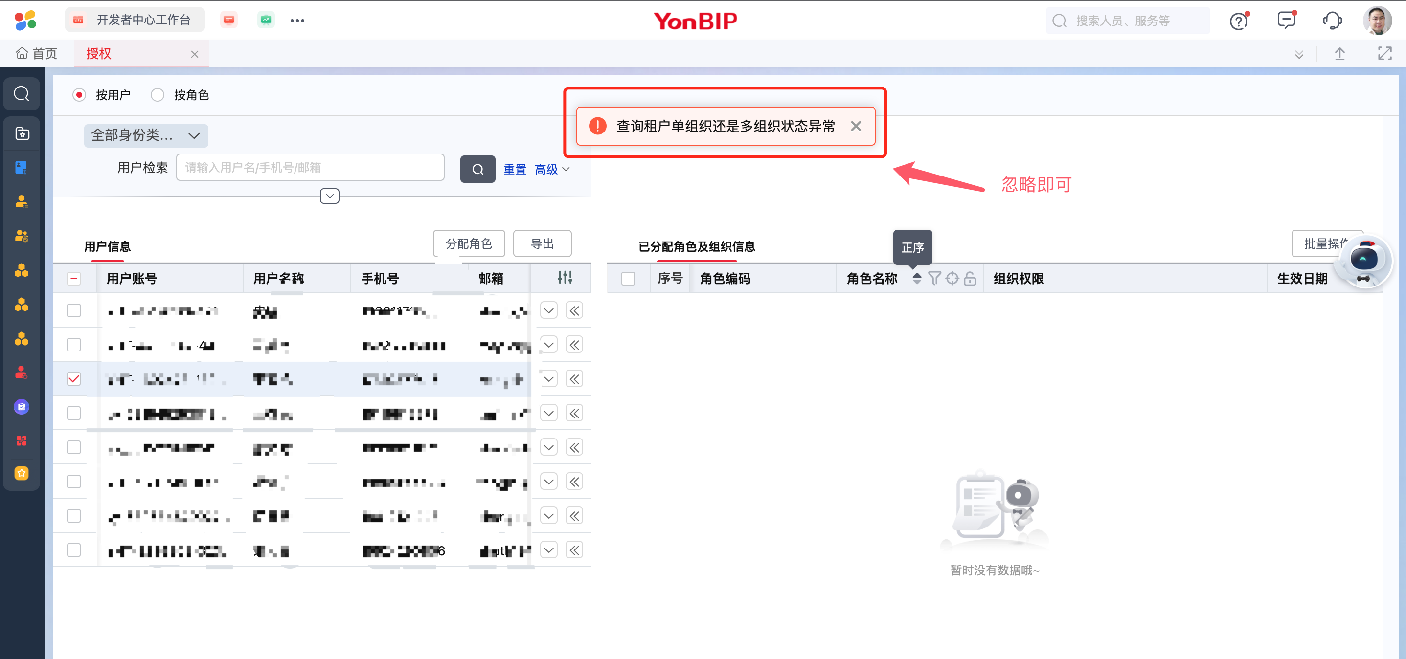 通过上面的操作,该名成员已经可以切换到我们的租户空间,并访问「移动开发」控制台了,不过他看不到应用。因为我们还差最后一步,赋予他具体的应用权限。