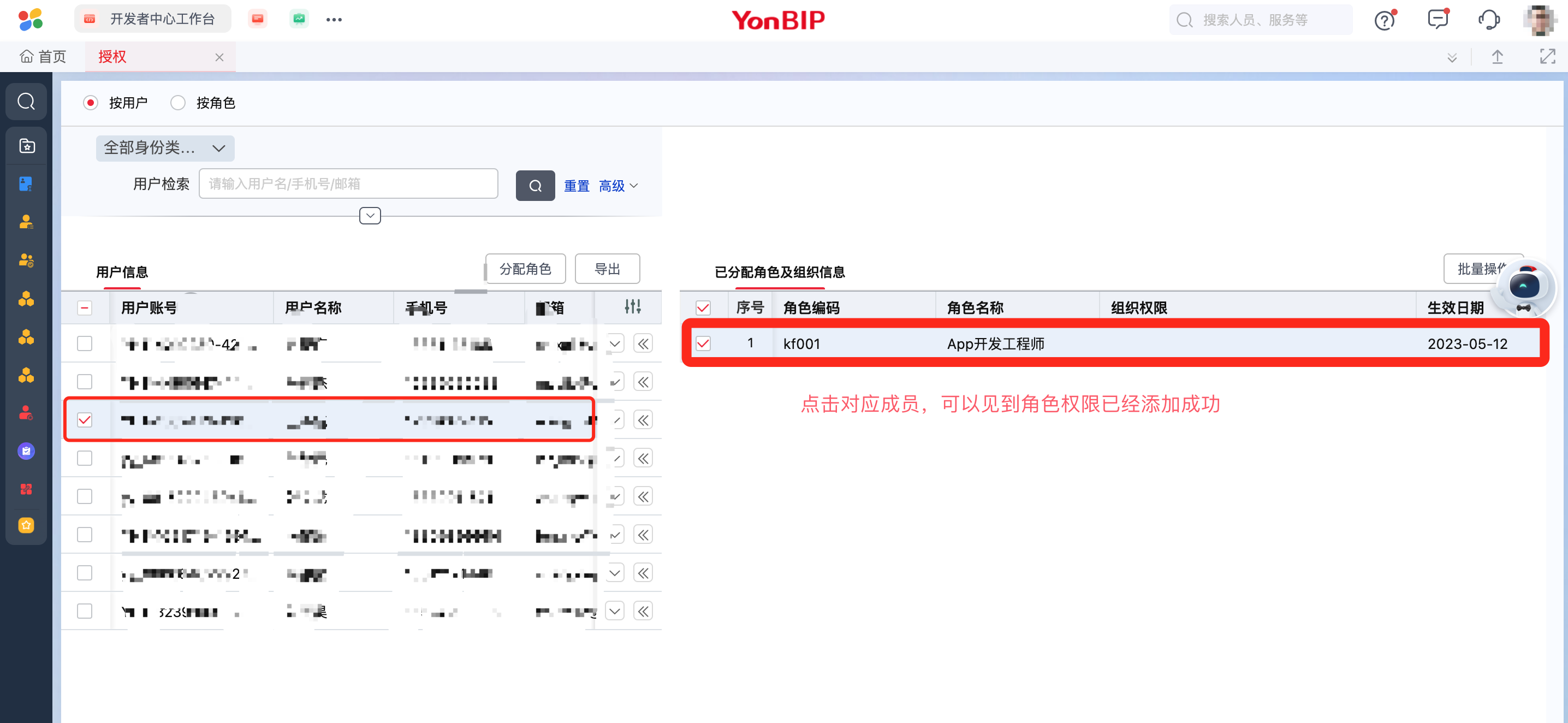 再次点击成员列表的改名成员,如果右侧出现了权限角色信息,则代表添加成功