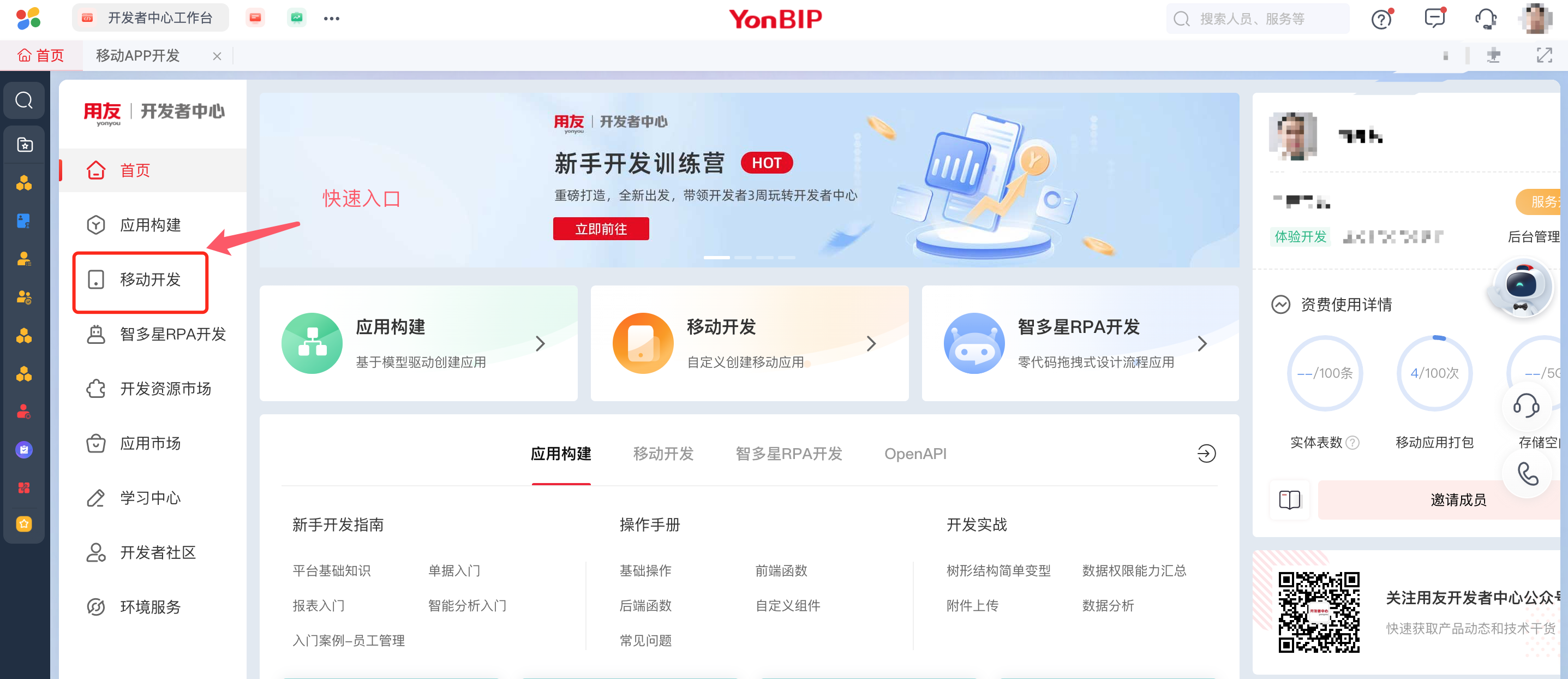 点击应用内页面 左侧菜单栏的「移动开发」,可以快速进入移动开发控制台