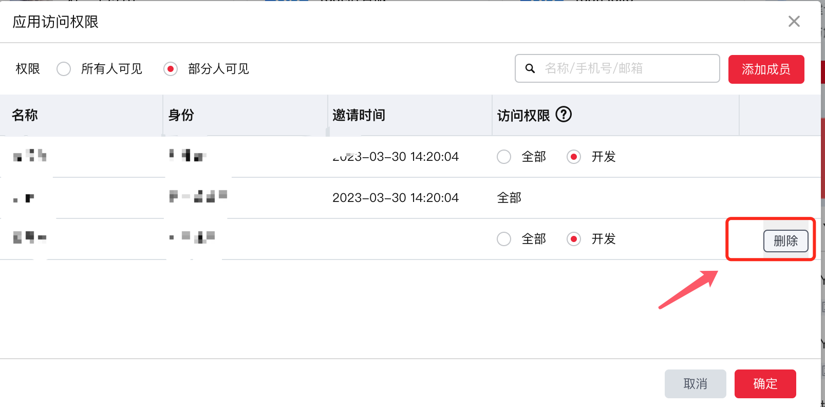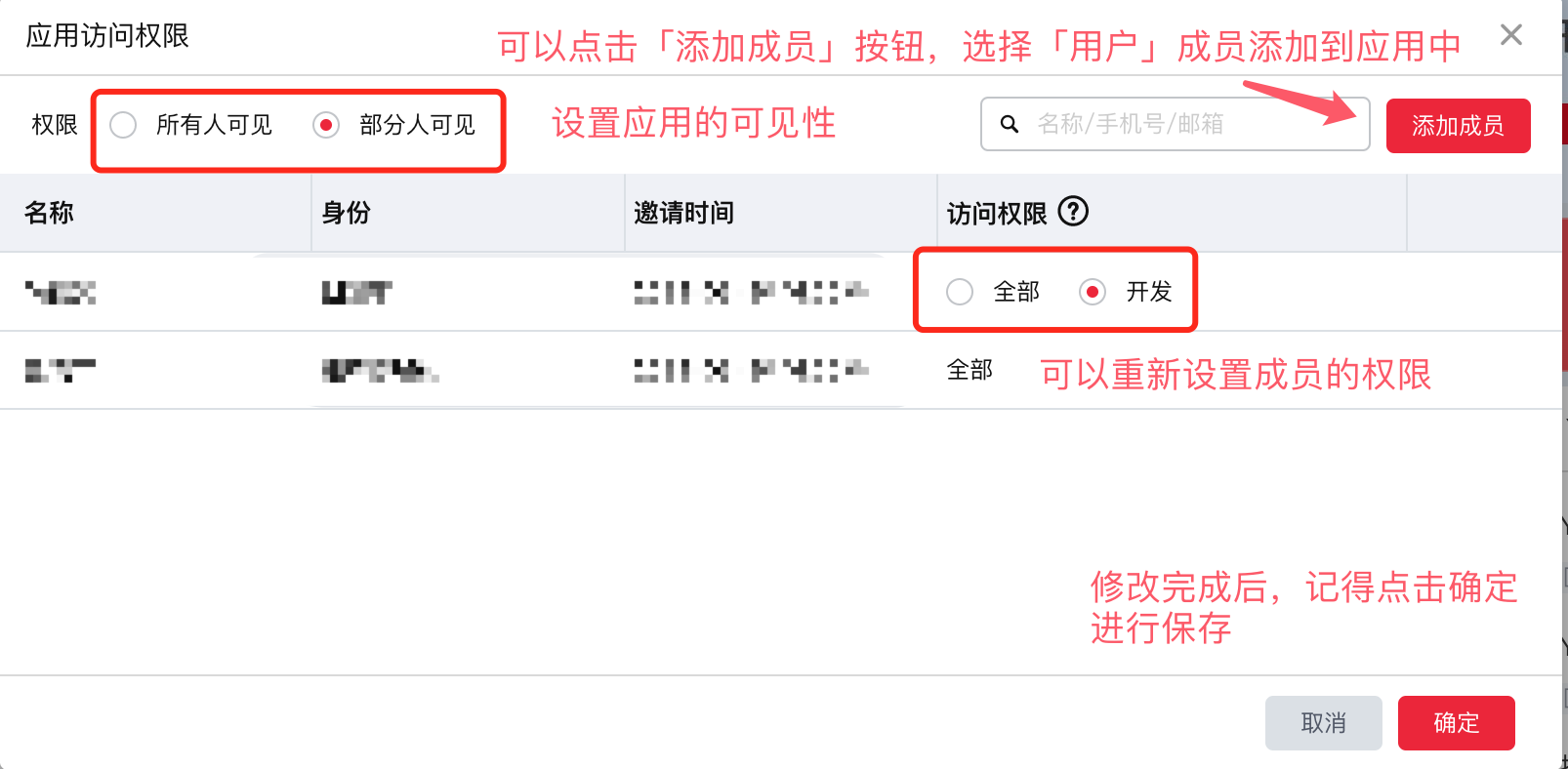 在弹出的「应用访问权限」对话框,可以添加成员,并进行相关的权限配置