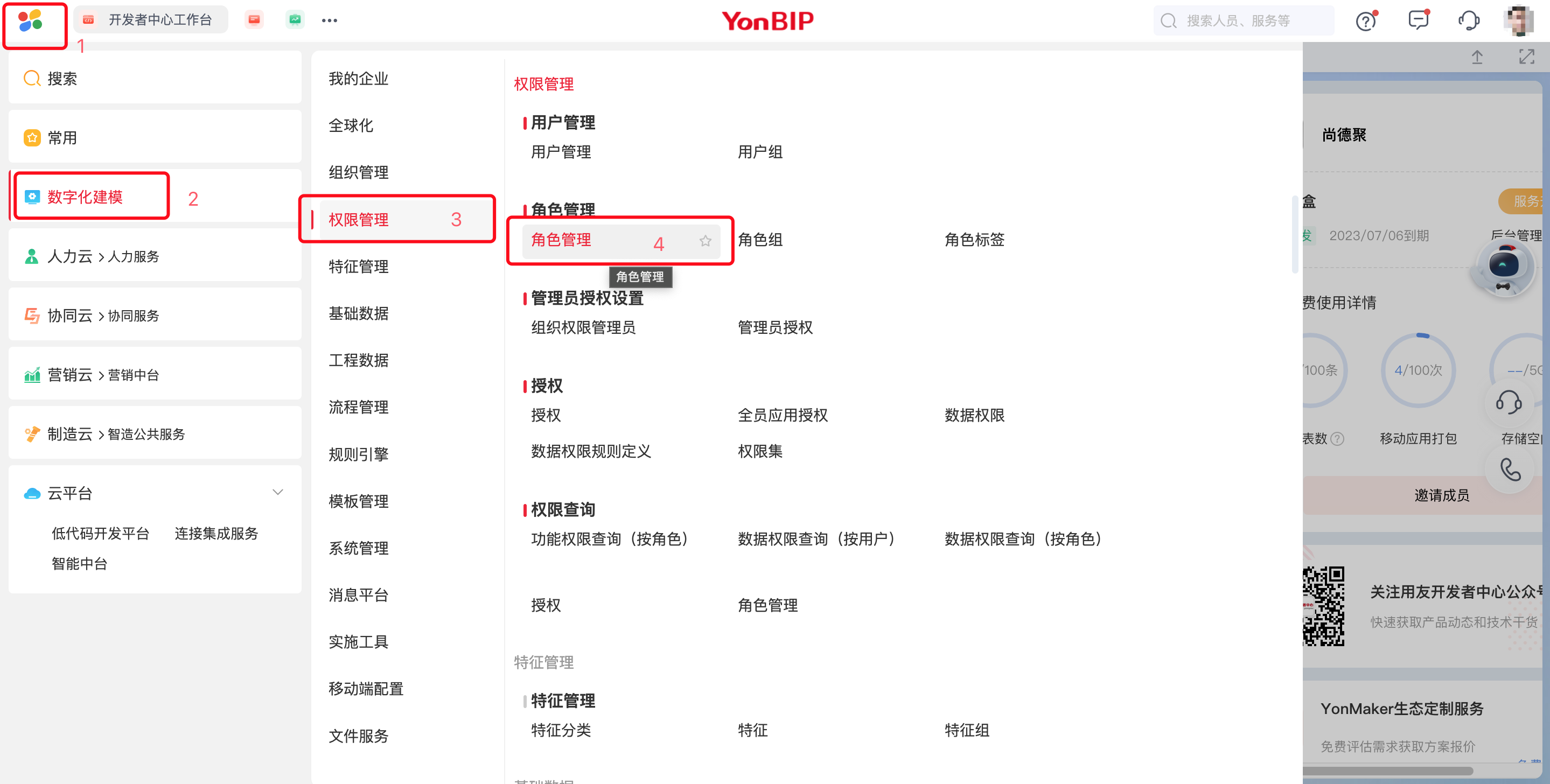 点击风车导航图标(左上角)-选择「数字化建模」-「权限管理」-「角色管理」
