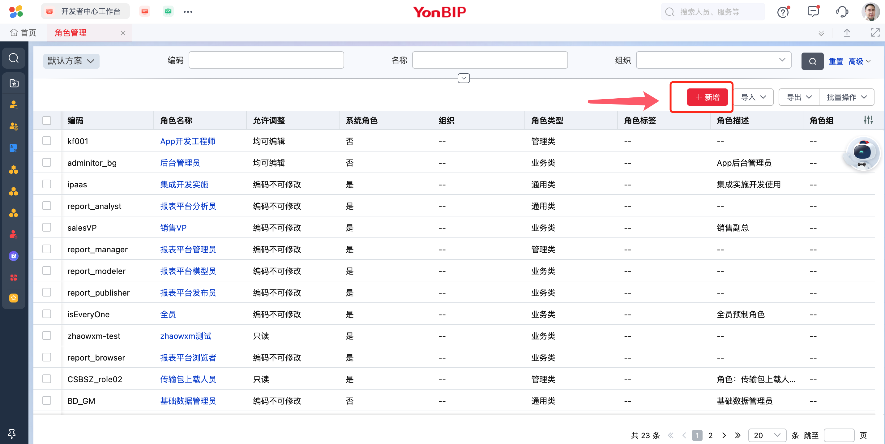在角色管理页面内,点击右侧「新增按钮」,创建新的权限角色
