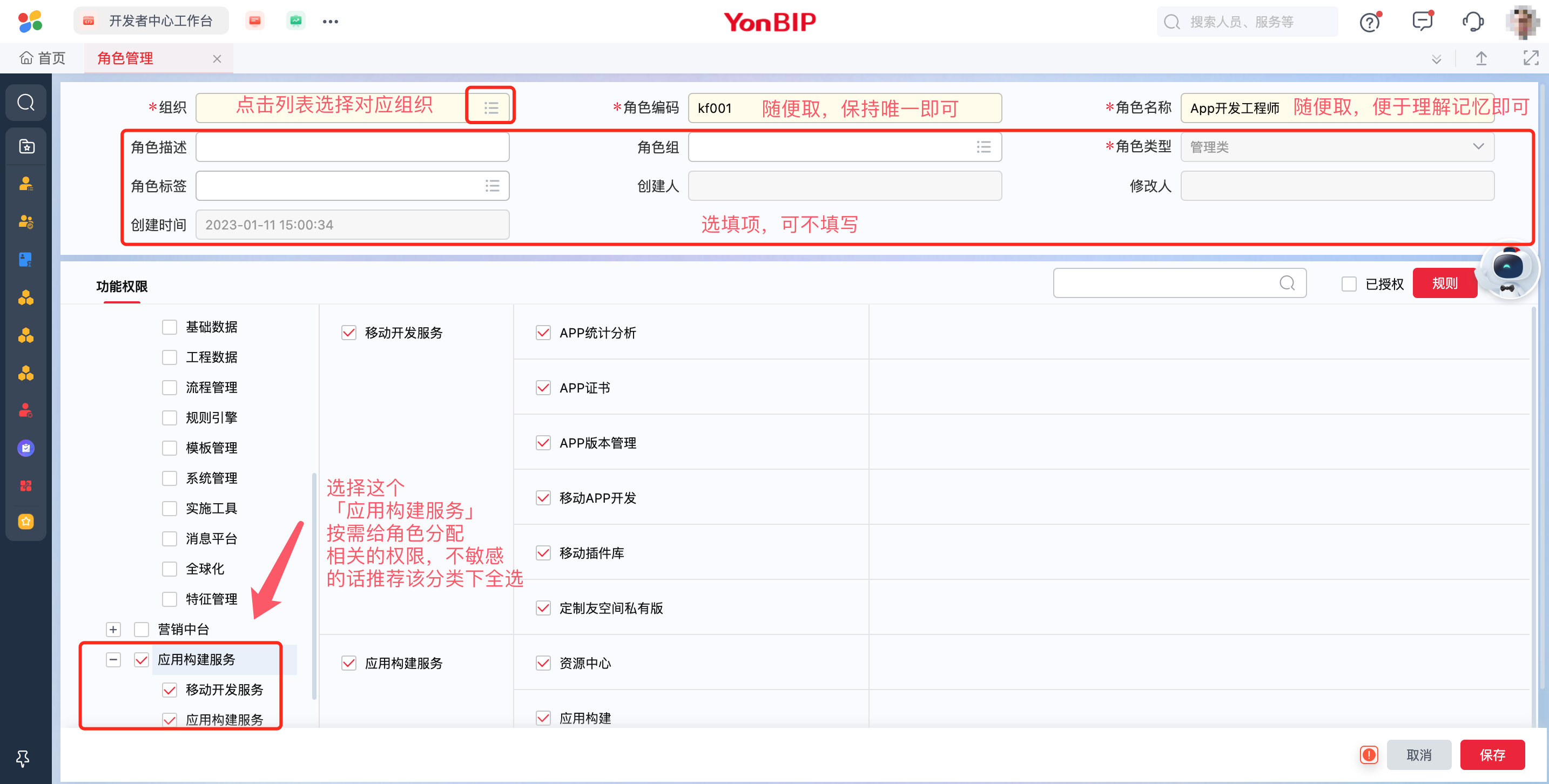 填写页面内的相关内容, 勾选选择「应用构建服务」分类下相关权限(重点),最后保存