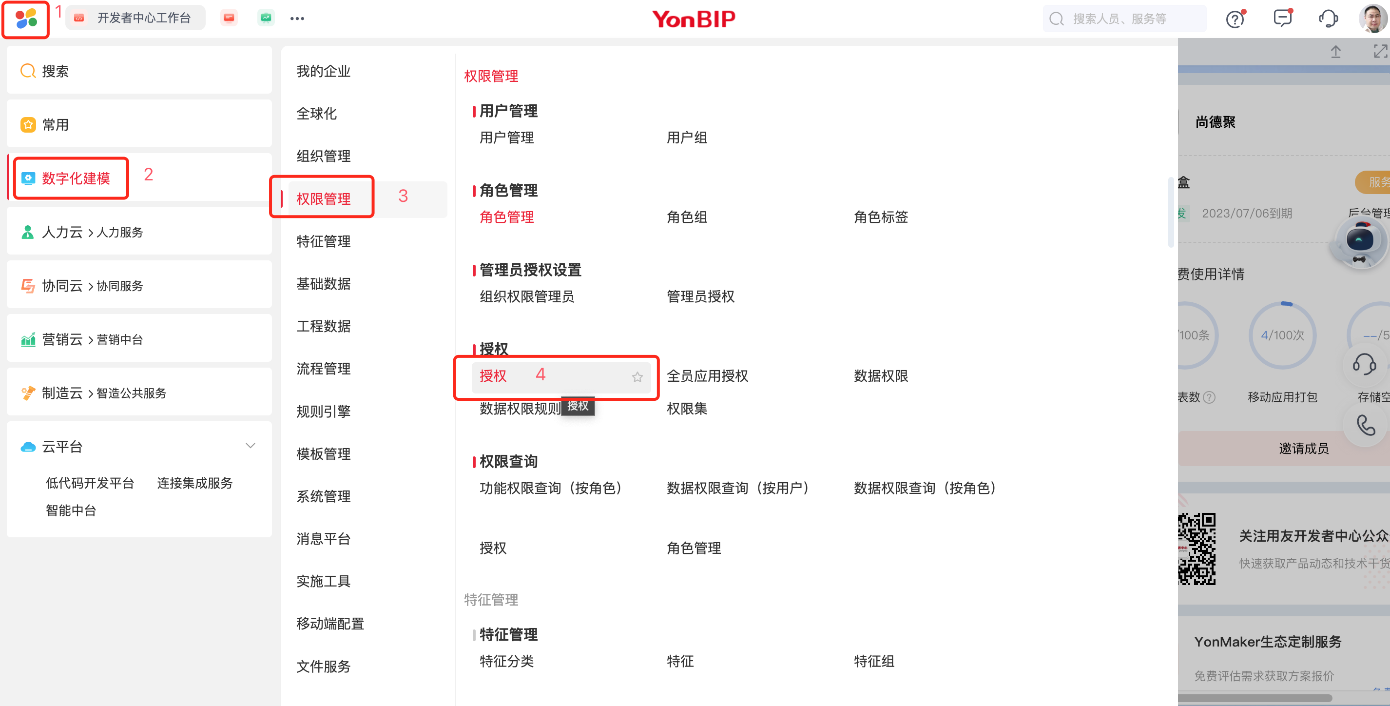 点击风车导航图标(左上角)-选择「数字化建模」-「权限管理」-「授权」