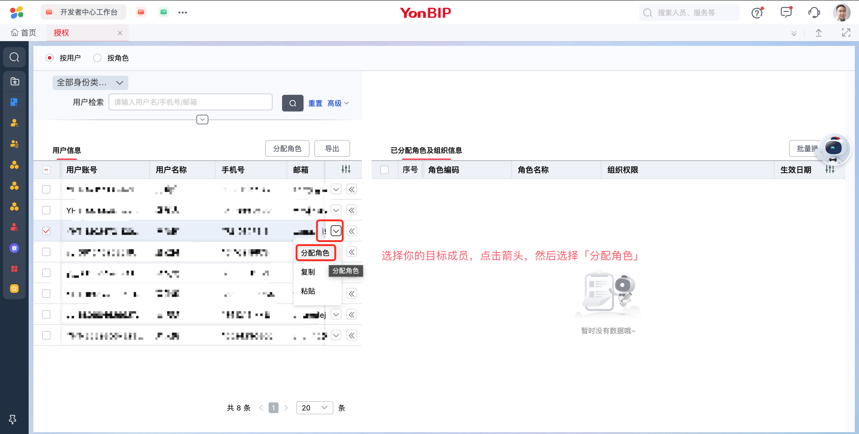 - 在授权页面内,在左侧的成员列表选择对应的成员,点击右侧的「向下箭头」按钮,在弹出的菜单选择「分配角色」