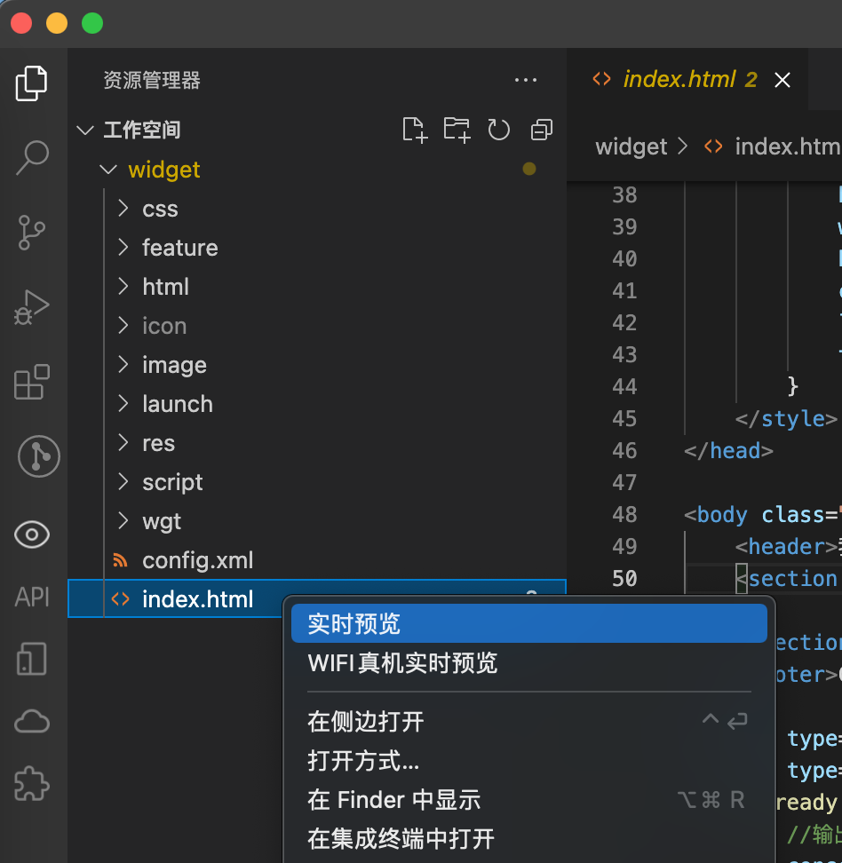 代码调试有多种方式,如果是查看纯粹的静态样式,可以使用浏览器打开对应页面(html或stml文件),或者直接在开发工具上鼠标右键点击页面文件,然后选择「实时预览」选项,即可在开发工具中查看