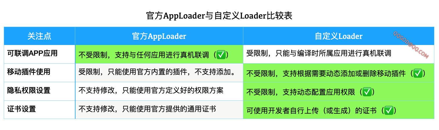 两者的区别是,友开发App内置的通用AppLoader可以配合任何一个App项目进行开发联调,而用户自行编译的自定义Loader只能给编译时绑定的那个应用项目使用,不能用于多个项目。简单总结就是官方Loader更快速方便,自定义Loader更灵活强大