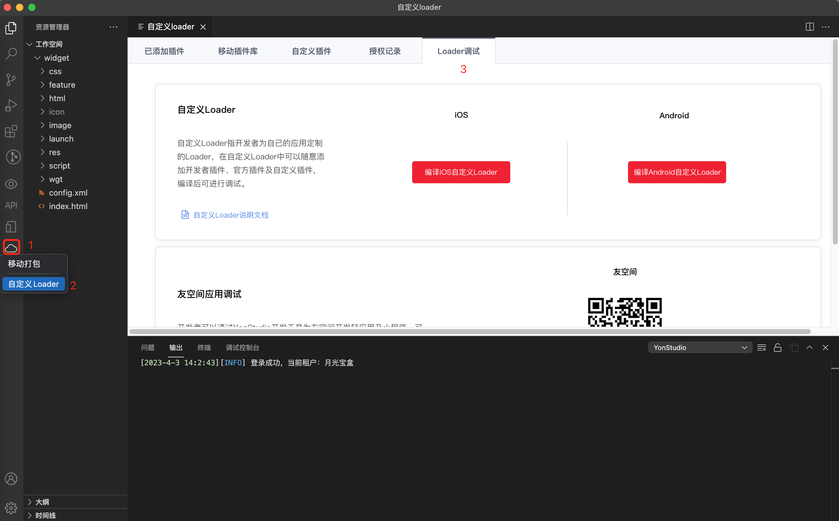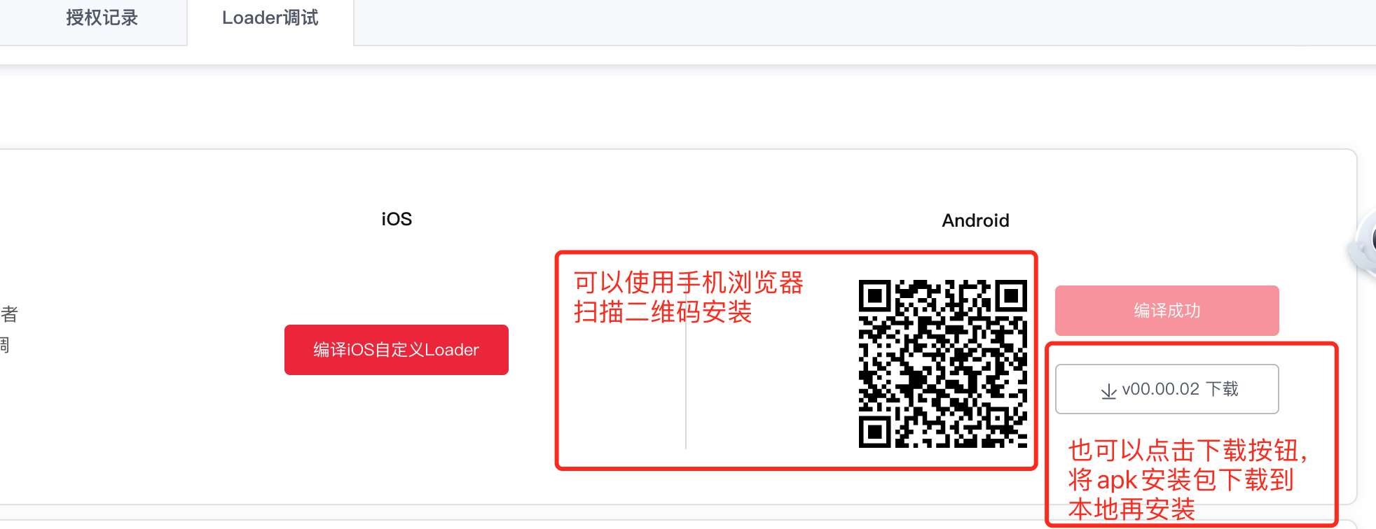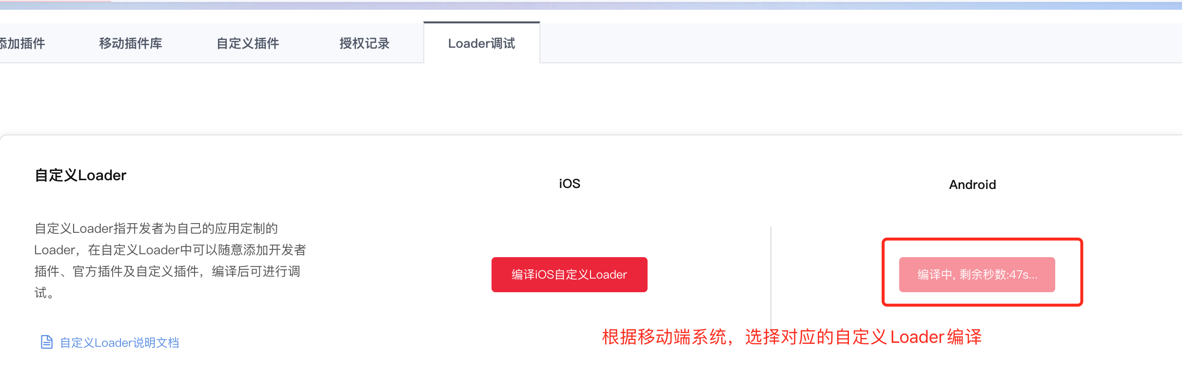 在Loader调试页,根据需要点击 「编译iOS自定义Loader」或 「编译Android自定义Loader」进行自定义Loader的编译,本教程选择 编译android端自定义Loader进行示范。