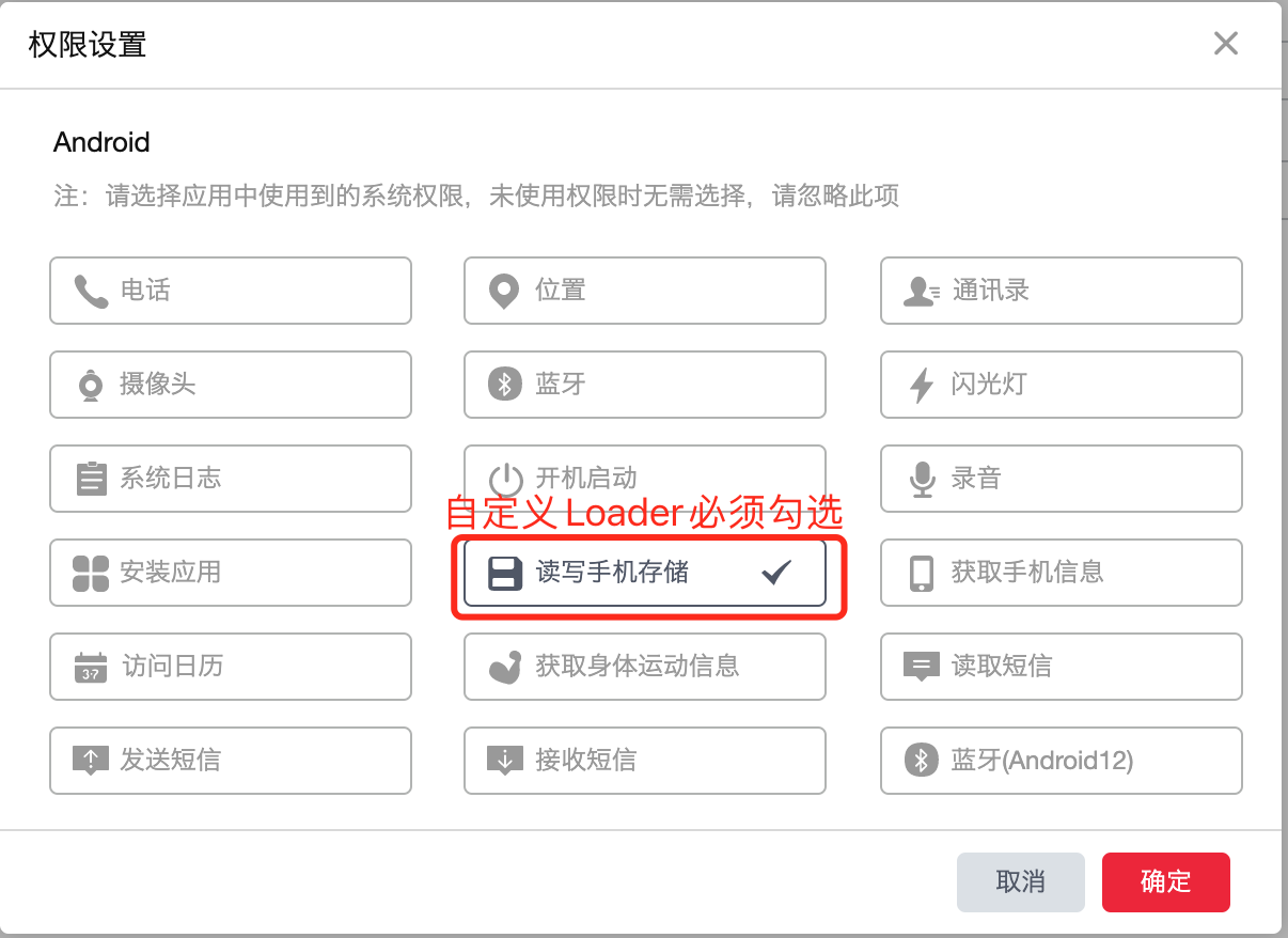 权限确认:自定义Loader需要「手机读写存储」权限,因为Loader需要保存电脑端的更新代码到本地。自定义Loader的权限配置是复用的「移动打包」内配置的权限参数,所以如果没有配置该权限,可以切换到「移动打包」面板,勾选响应的客户端类型,进行权限的配置。(权限配置的操作之前章节已介绍,还不太熟悉的同学可翻阅之前章节学习)