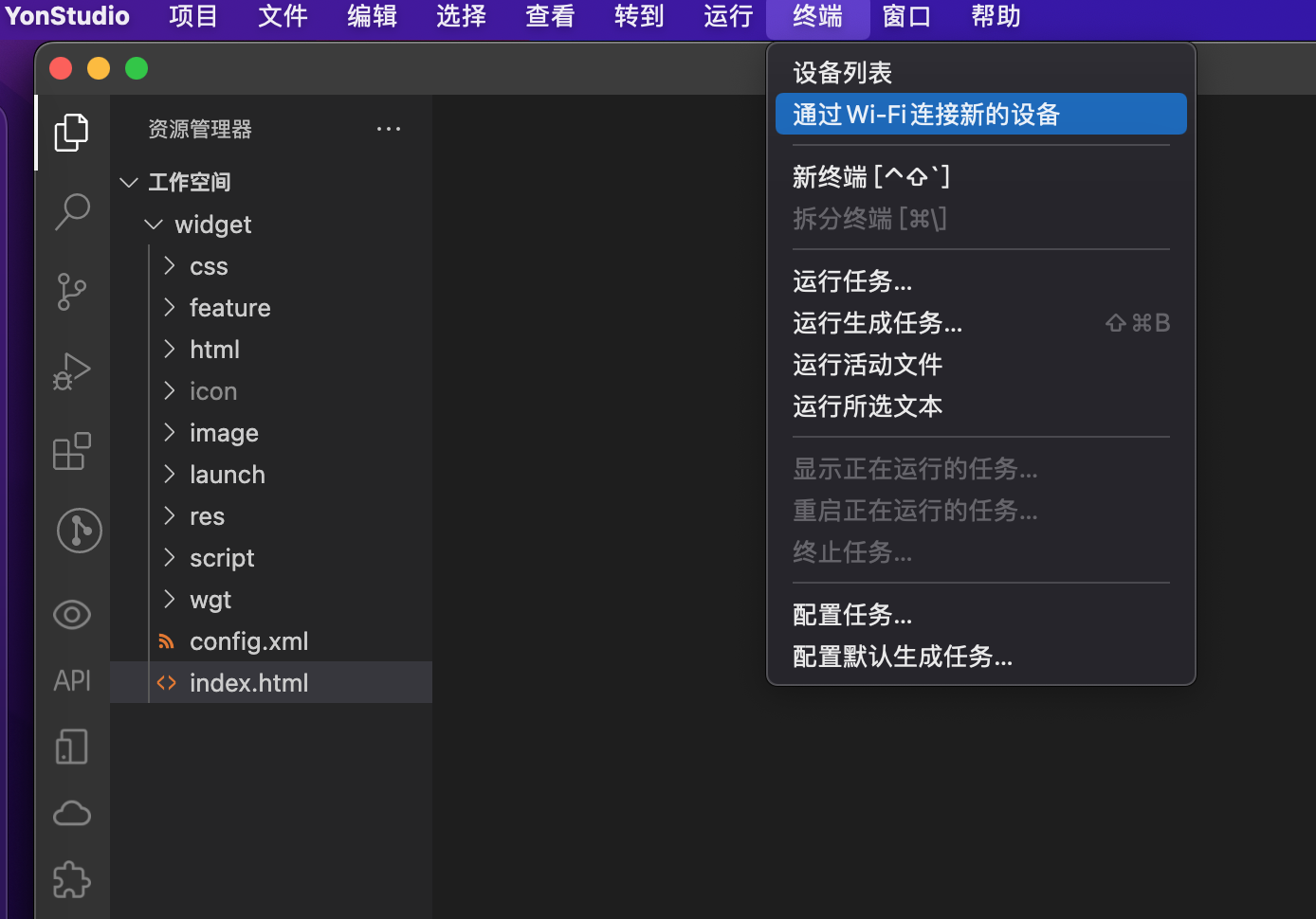 7.2.3.1 在YonStudio 开发工具中,点击顶部菜单 「终端」- 「通过Wi-Fi连接新的设备」