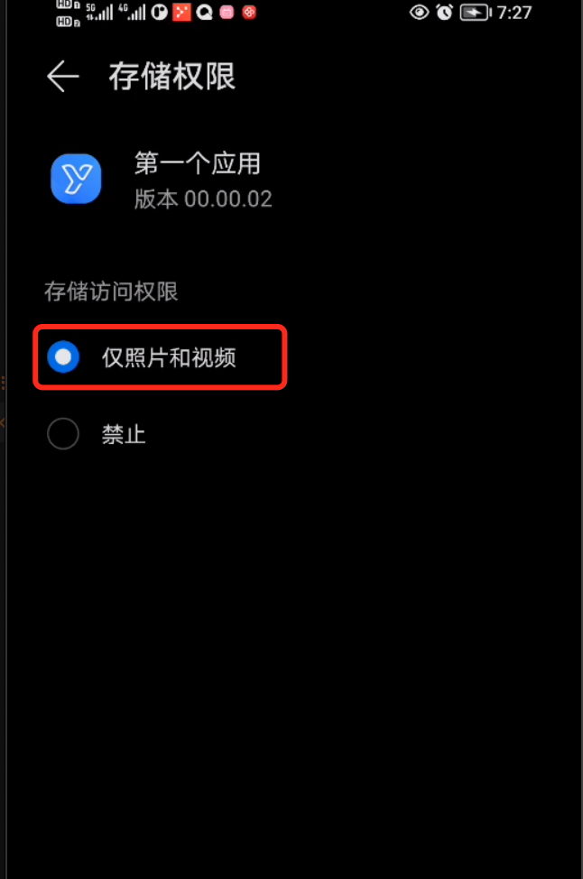此时,需要切回手机主页面,进入手机的 设置页面去给当前的应用「第一个应用」授权「存储」权限。