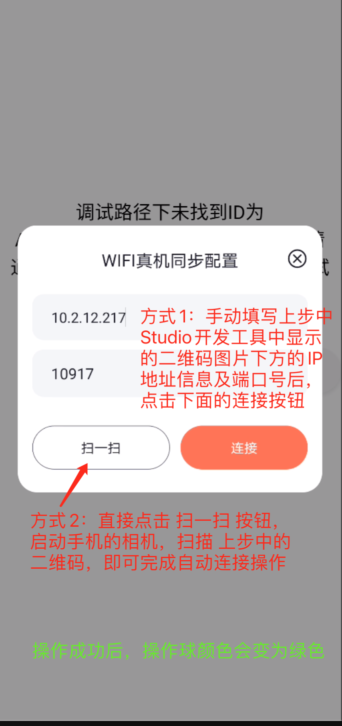 双击灰色操作球,调起连接面板,这里就对应到在开发工具上显示的二维码设备连接界面了。可以直接点击扫一扫按钮,启动相机扫描二维码完成连接,也可以点击输入框进行手动输入相关的IP地址和端口号信息,然后点击连接按钮进行连接,如果连接成功后,操作球会变成绿色状态。