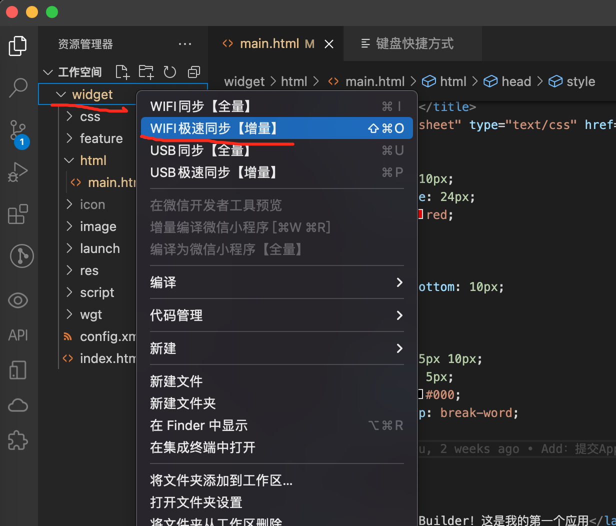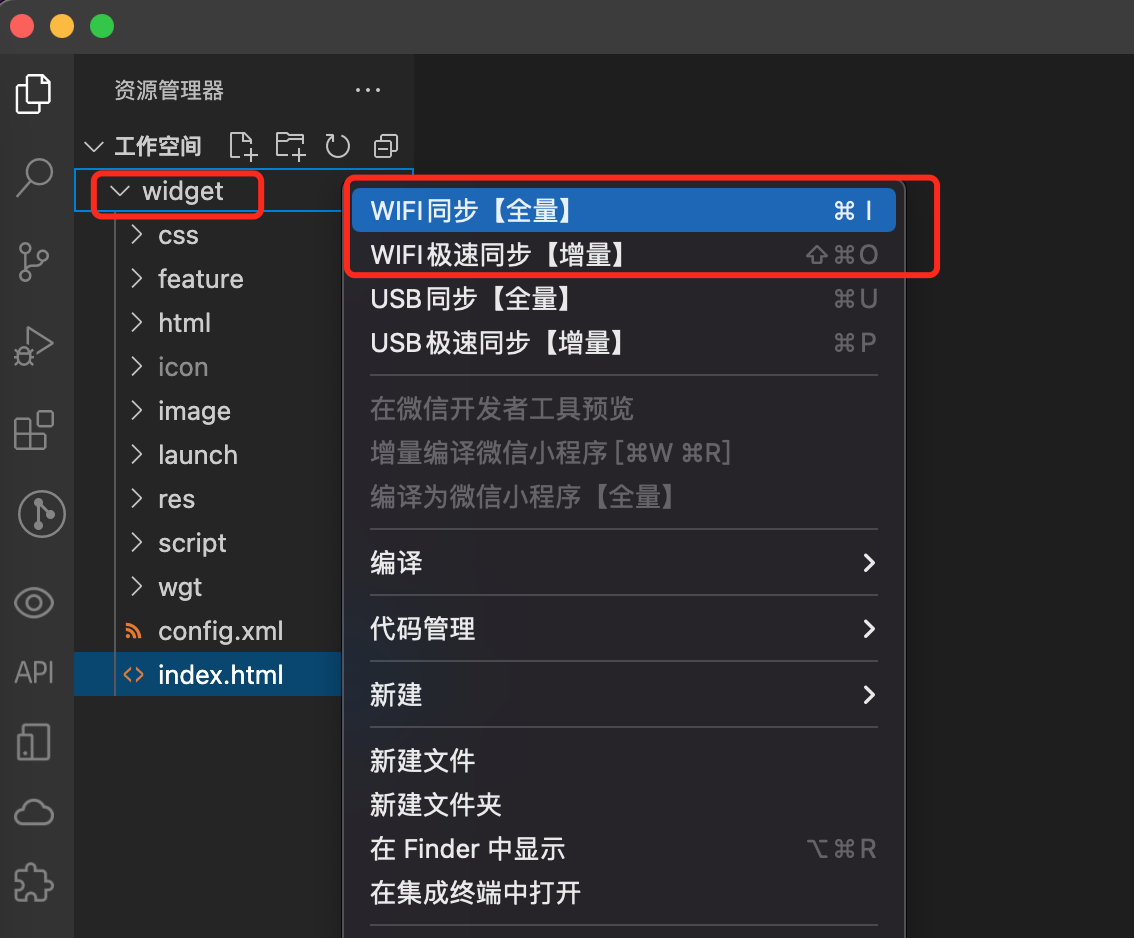 建立连接成功后,在开发工具中鼠标右键点击根目录,然后「选择WIFI同步【全量】」(也可以使用快捷键操作,不同的操作系统快捷键并不相同,下图是在MacOS系统下的截图)。