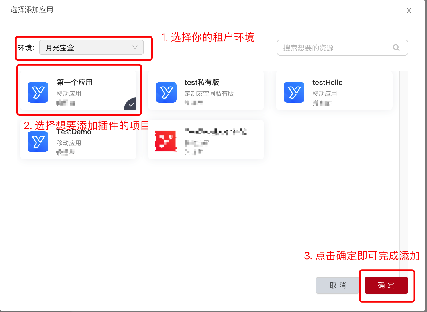 即在登录状态下,按上面 8.1 介绍的方式,访问资源市场 ,搜索栏输入关键词 moviePlayer,找到对应的插件,点击打开插件详情页,然后点击「立即使用」按钮,在弹出的弹窗上选择对应的租户和应用,即可完成插件的添加。