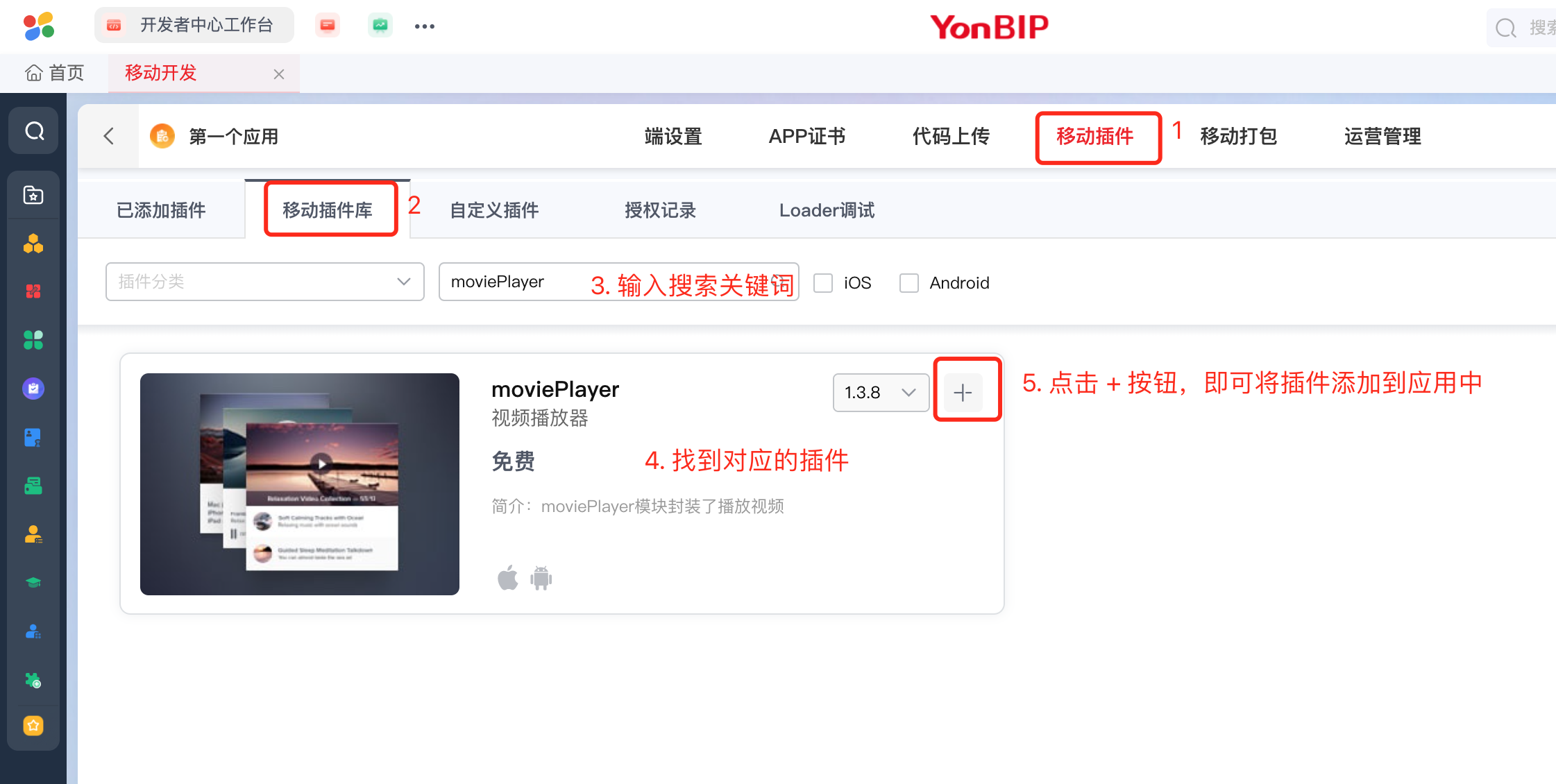 上面介绍了未登录状态下,查看移动插件的方式,当真正想要使用移动插件时,还是需要在登录状态下进行。当前官方提供两种添加移动插件的方式,下面以集成一个 moviePlayer 为例(这个是官方封装的免费的视频播放器移动插件),详细讲述下如何使用YonBuilder移动开发的移动插件。
