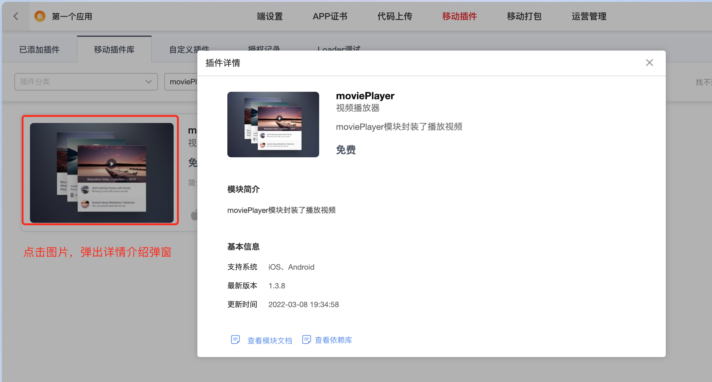 列表页选择对应的应用,点击即可进入应用的管理界面 - 切换导航到「移动插件」- 二级导航切换到「移动插件库」- 搜索栏输入关键词