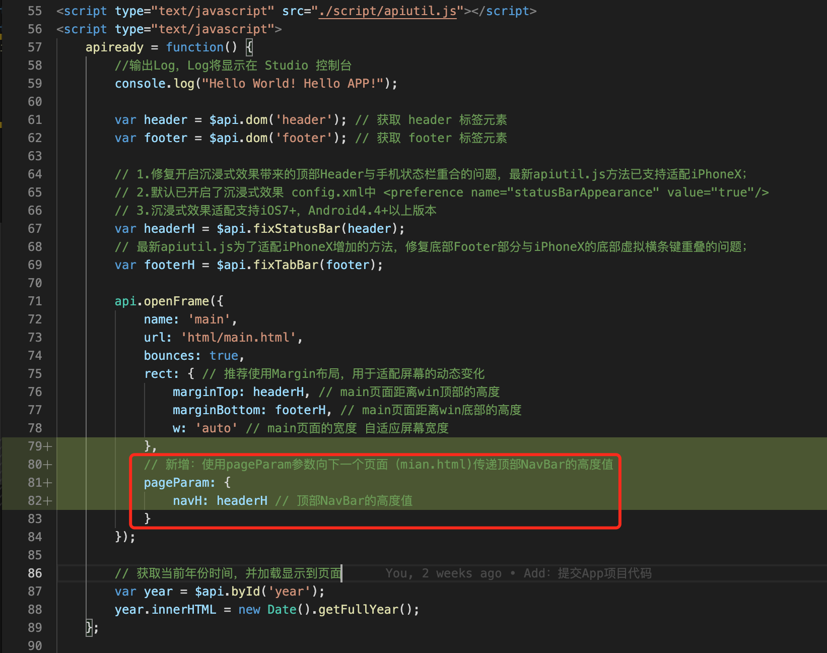 在 index.html 页面内的 79 行,为 api.openFrame 增加以下 pageParam 参数, 具体代码如下