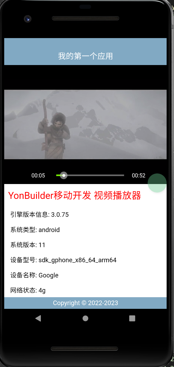<body> <div id="wrap" class="video-wrap"></div> <label>YonBuilder移动开发 视频播放器</label> <div id='sys-info'></div> </body>PS: moviePlayer 移动插件是使用原生语音开发的,并不在html的dom文档流内,所以需要创建一个dom元素去占位,避免 播放器的界面遮挡了原来的dom元素内容。