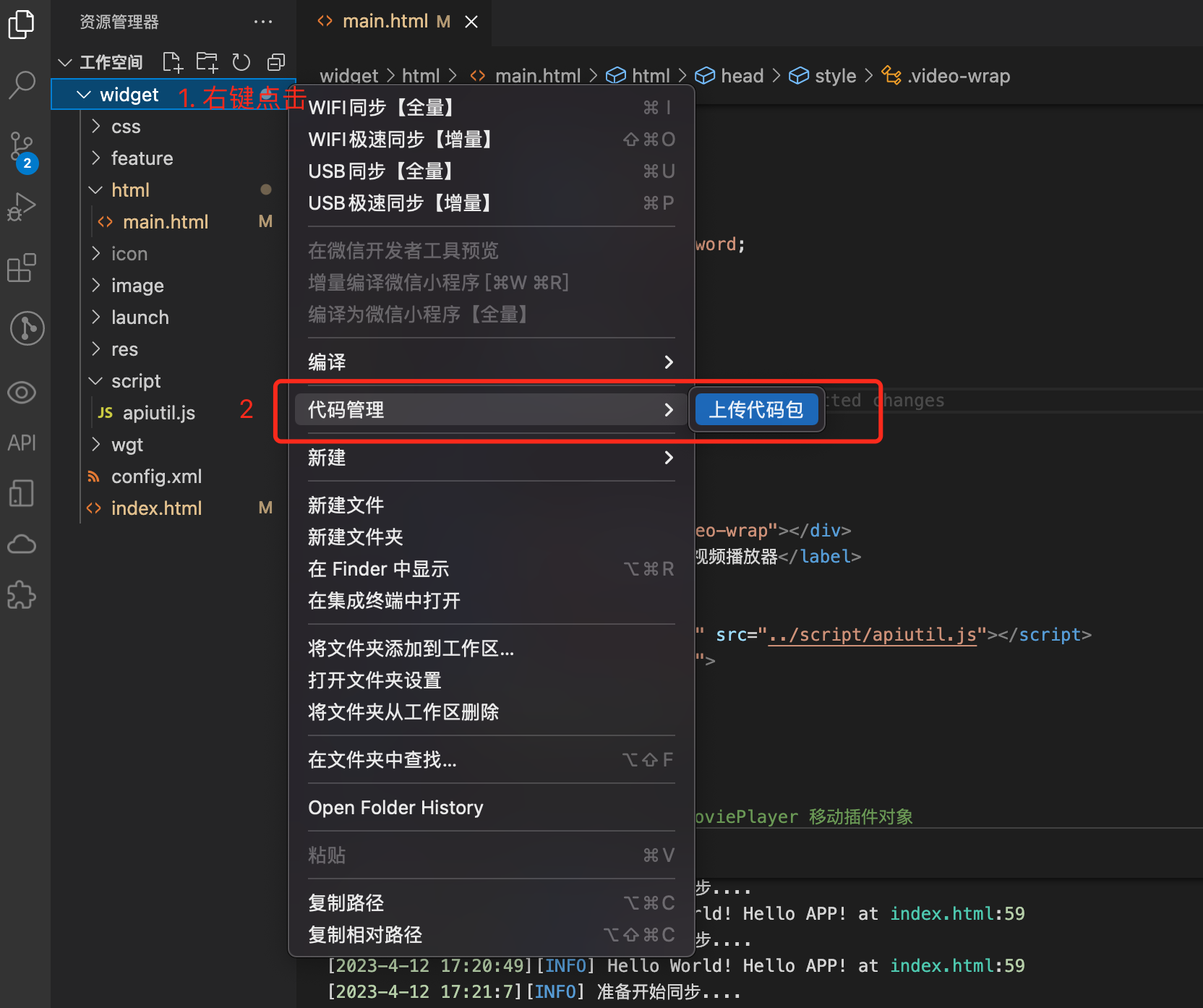我们选择最简单的方式,在YonStudio中,右键点击 widget 文件夹,选择「代码管理」- 「上传代码包」