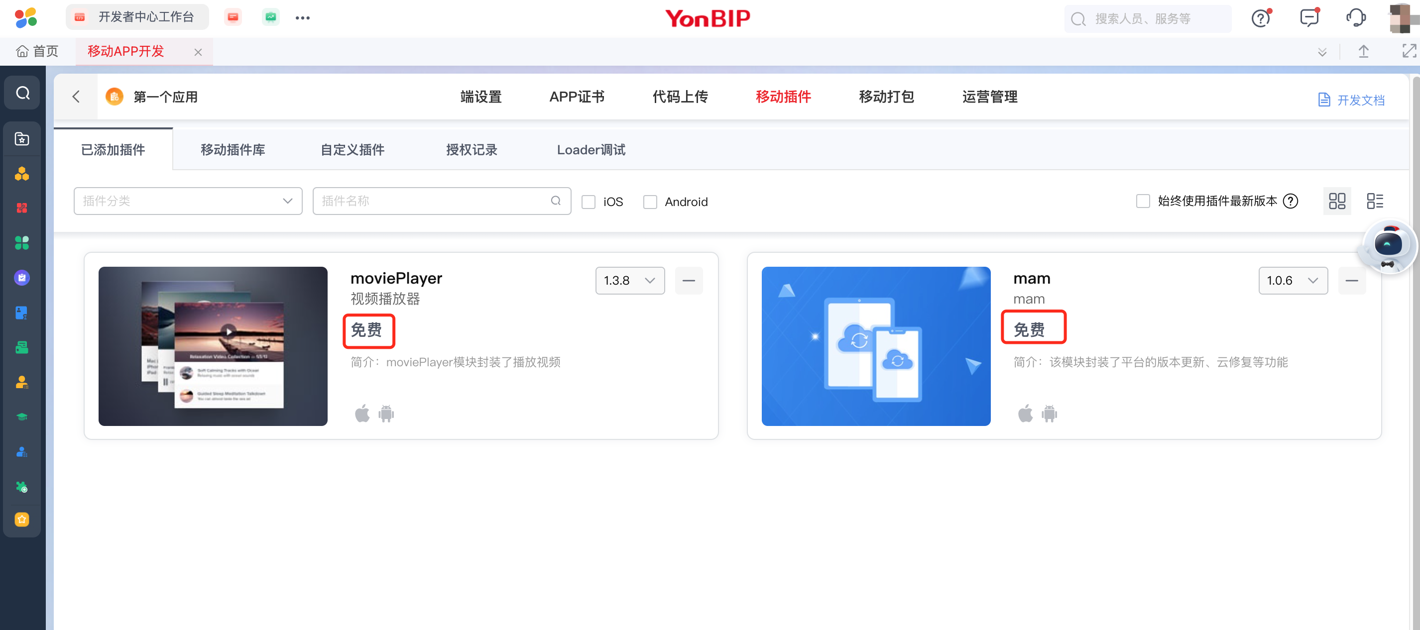 PS: 注意移动插件是分 免费 和 收费 两种类型, 收费的移动插件仅支持测试版的免费使用,在编译正式版本时,需要提前支付相关费用才可以进行编译。