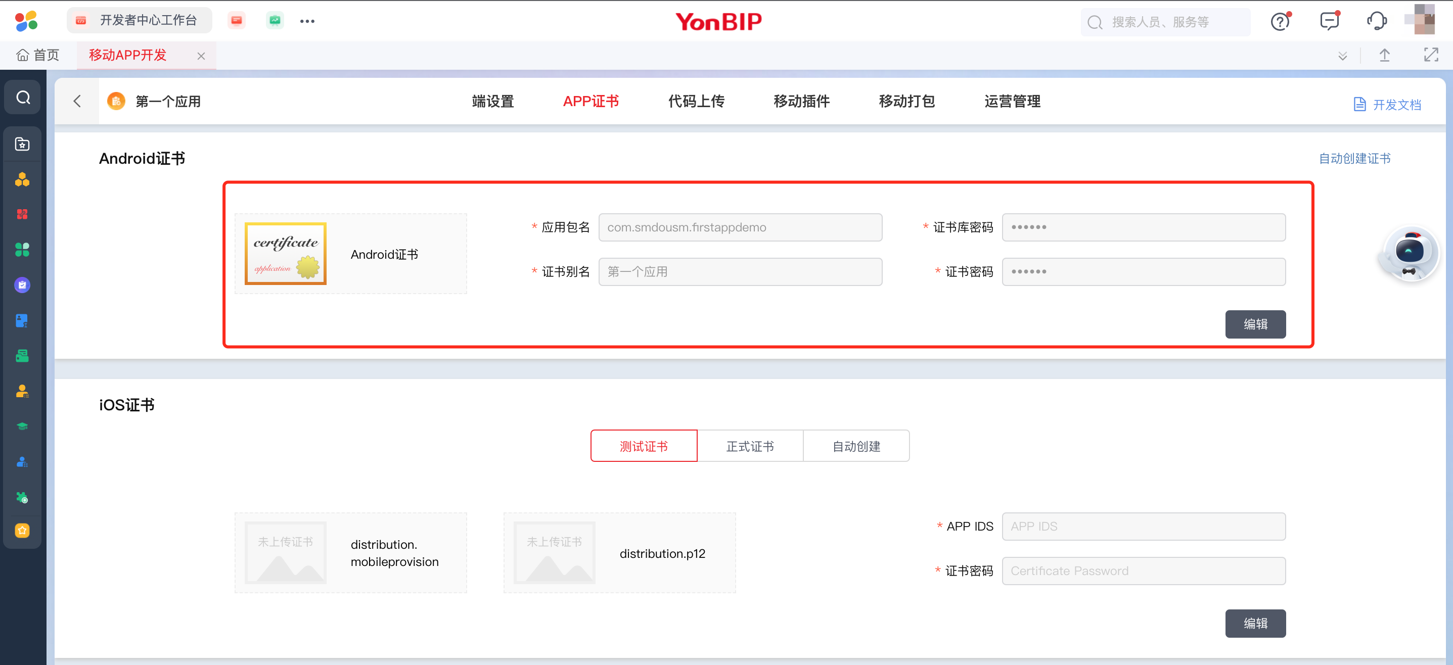 此处检查一下应用是否已上传证书,我们直接章节的操作正常是已经上传完成的,如果没有可以选择创建或上传证书。(具体操作可参加 之前的章节(3)中 6.2.1 添加应用证书 的相关介绍说明。