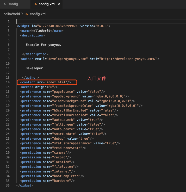 在YonStudio开发工具下,config.xml被可视化了,它的入门文件位置见下截图