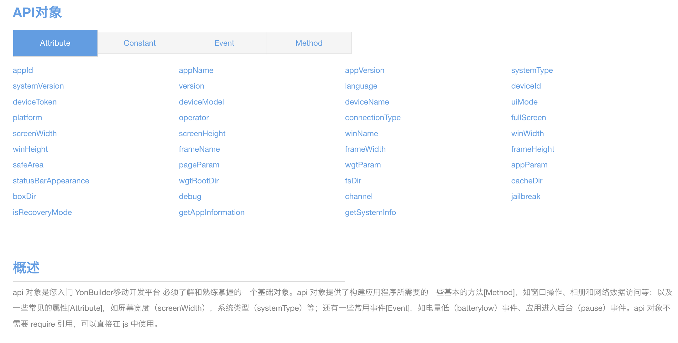 这些api对象方法是YonBuilder移动开发引擎环境所特有的,在原本的浏览器环境中并不存在,所以需要引擎在加载html页面时,去动态注入api对象后,在相关的程序方法中才可以正常调用,否则就会报错。而apiready函数就是一个显性的生命周期事件,是引擎用来告诉程序,现在api对象已经加载完毕,可以正常调用了。