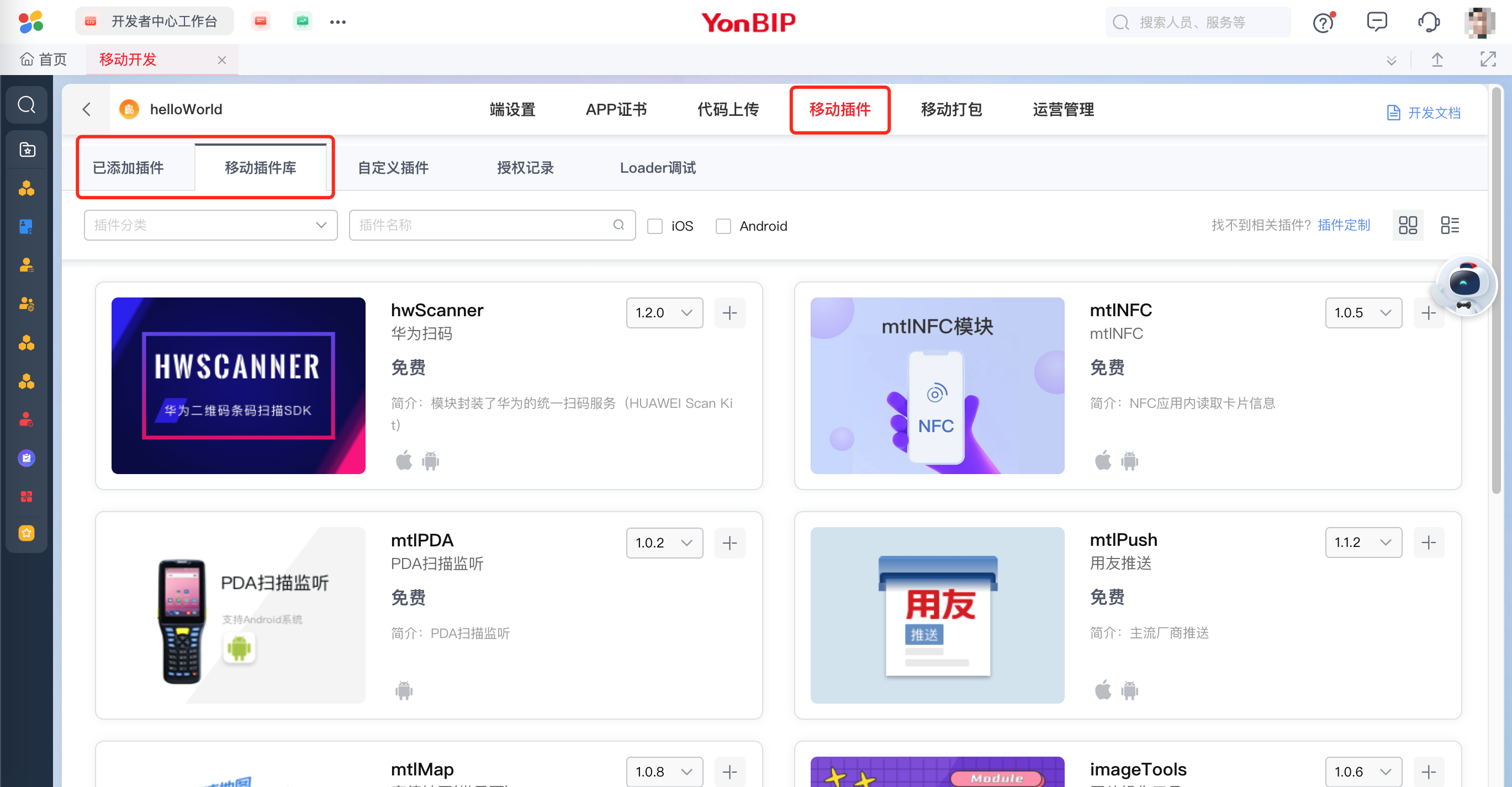 已登录情况下,可以在租户下-「移动开发」-「移动插件」下的「已添加插件」或「移动插件库」去查看移动插件