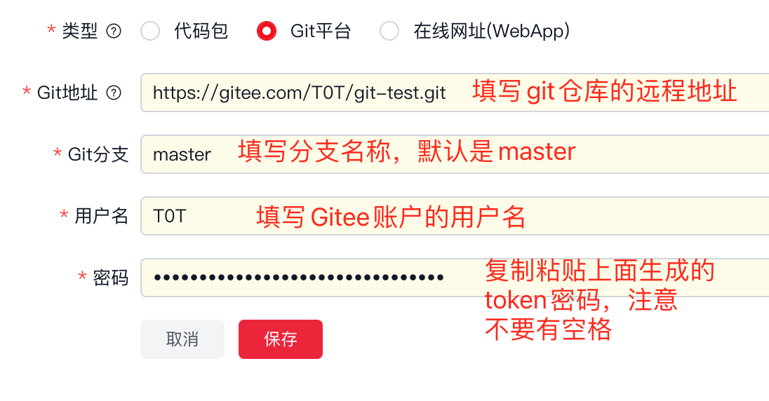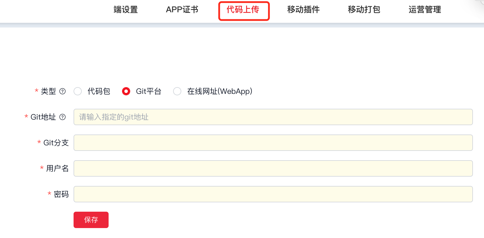 切换到「上传代码」面板,类型选择「Git平台」,按输入框内容,填写相关的信息即可。