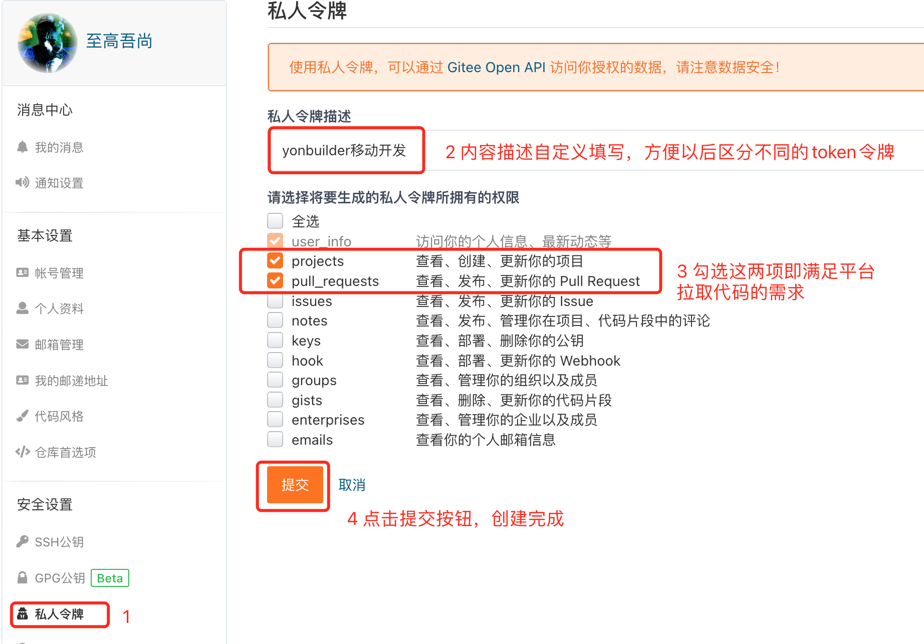 3 点击右上角的「生成新令牌」,进入私人令牌创建页面,按需求勾选令牌权限,点击提交即可。