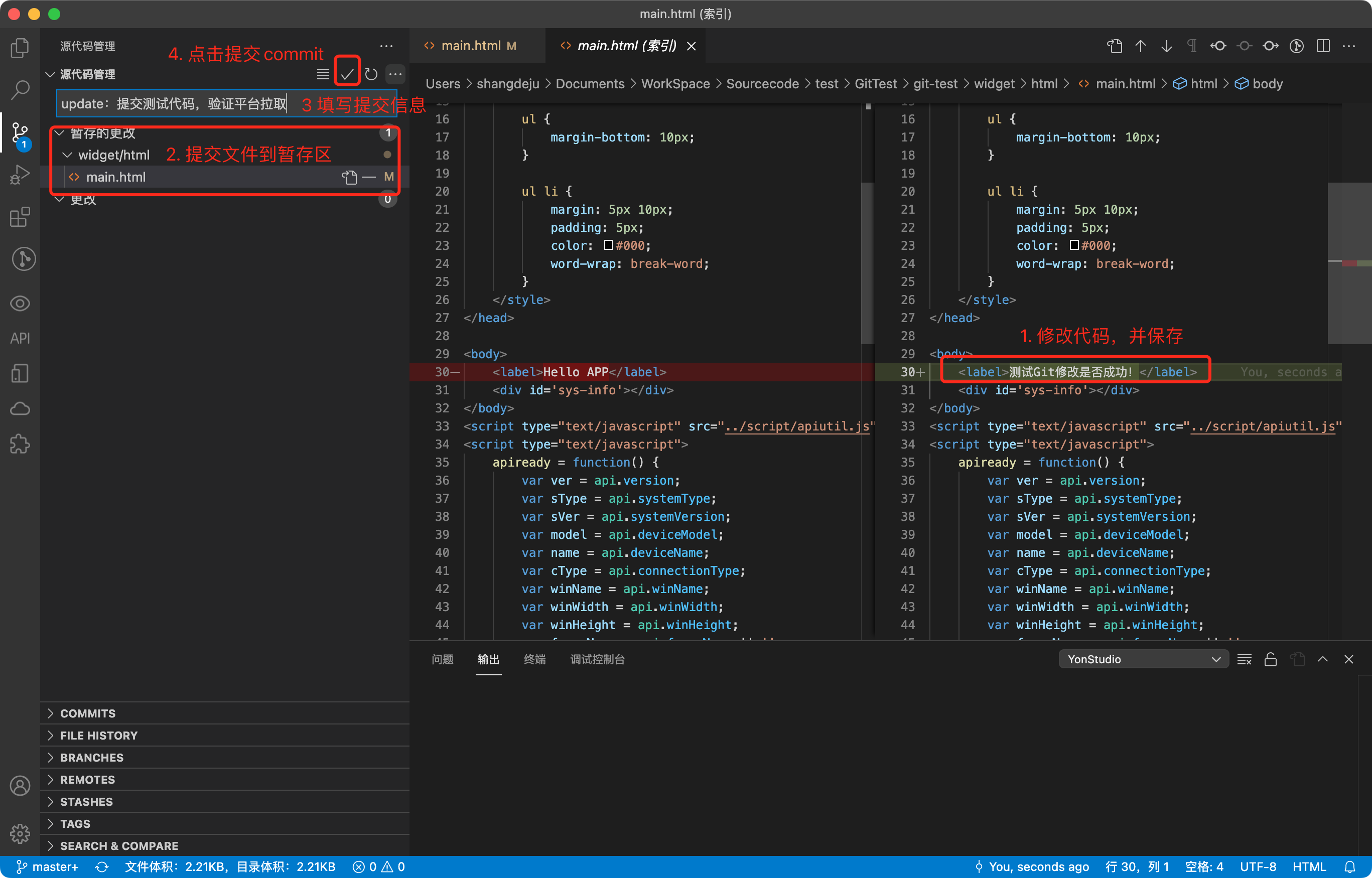 2.4.1 开发者在YonStudio里,对项目代码内容进行修改,然后提交的Git仓库