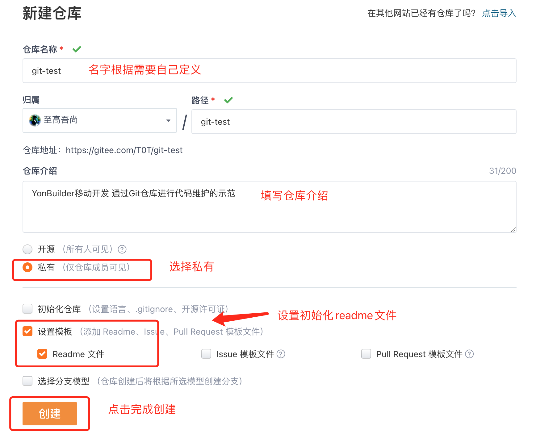 填写仓库信息,点击按钮完成 Git 仓库的创建