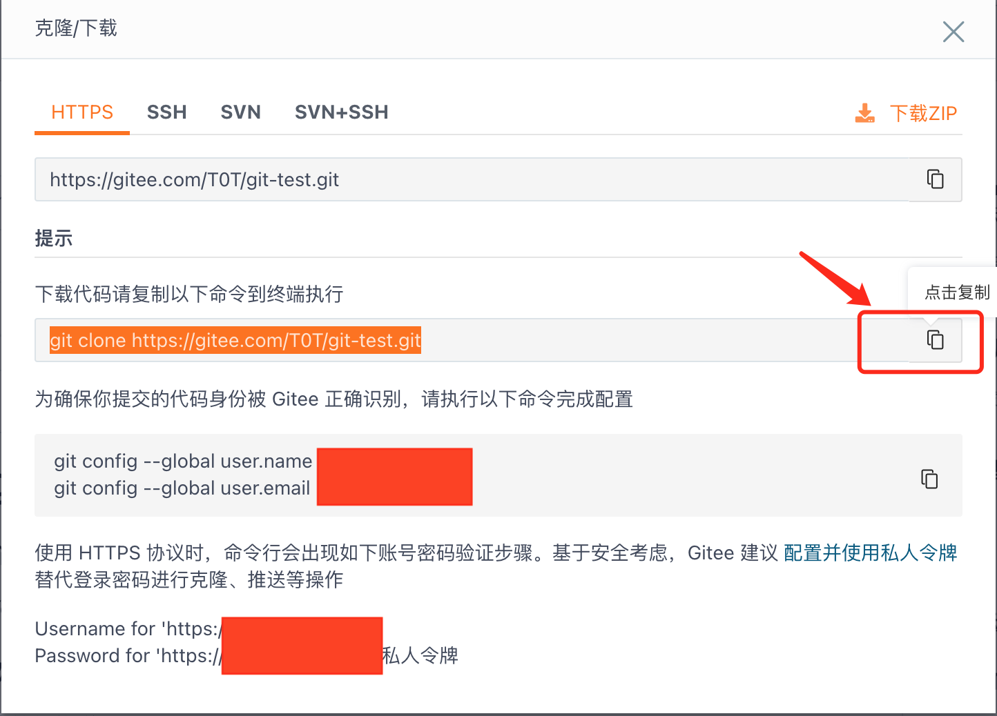 PS: 关于这里需要输入的用户名和密码,即可以输入真正的 Git 账户邮箱和账户密码,也可以出于安全角度的考虑,创建一个有限权限的 Token(即私人令牌),然后填写 Token 密码去替代账户密码。这样即使该密码泄漏,也仅仅是有限的权限,不会危及到整个账户安全。