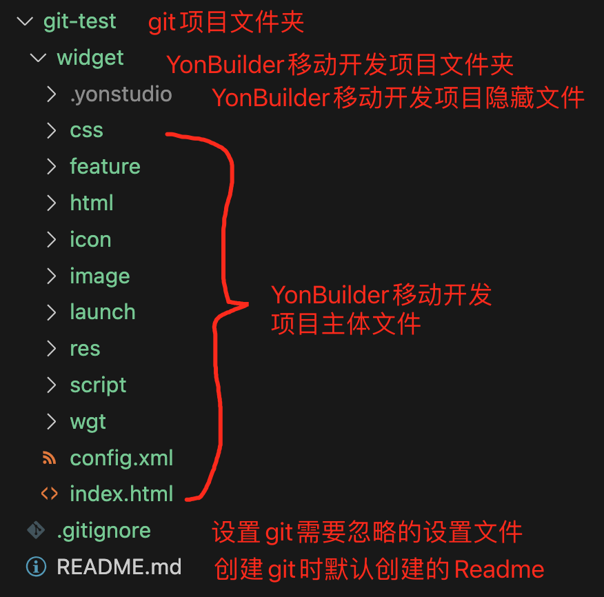 在 Git 文件夹(本文是 git-test)内创建 .Gitignore 忽略文件,文件内容按项目需要和自己的平台类型添加通用的忽略文件类型,本文此处重点告诉大家添加需要忽略的 YonBuilder移动开发 的项目文件,具体就是在.Gitignore 内,添加以下内容: