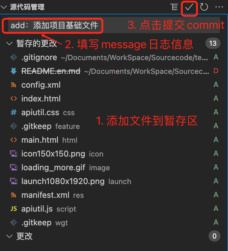 +图标,添加到暂存区; - 2 填写提交